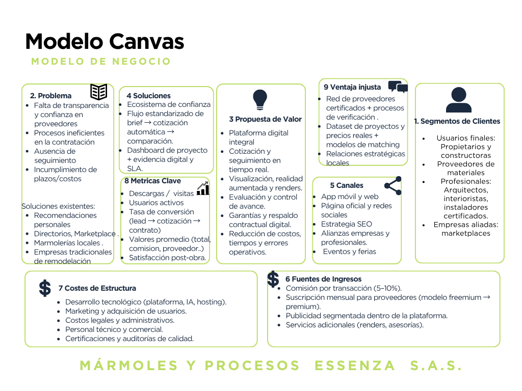 Este proyecto tiene como objetivo diseñar e implementar una solución de innovación comercial y operativa para Essenza, empresa del sector de acabados de piedra, con el objetivo de mejorar la experiencia del cliente y la eficiencia interna. Con el apoyo de un análisis diagnóstico que mostró una alta dependencia de referencias, presupuestos manuales, baja trazabilidad y riesgos en el modelo B2C, este MVP se propone con base en un flujo de trabajo estructurado: presupuestos en menos de 24 horas, seguimiento de hitos con listas de verificación y documentación, y un panel de control con indicadores clave de rendimiento. El desarrollo de la solución se basó en metodologías de gestión de proyectos, como Design Sprint y Lean Startup. La validación se realizó mediante cuatro cuestionarios aplicados a clientes habituales, arquitectos, diseñadores, proveedores y mediante una comparación competitiva con empresas locales. Los resultados de los instrumentos medidos sobre la aceptación del concepto, la claridad percibida, la disposición de uso y el NPS mostraron una alta aceptación y una mayor confianza de compra en comparación con el proceso actual. Los objetivos del plan en cuanto a los resultados esperados son: para los primeros 6 a 12 meses, un aumento del 30 % en los ingresos no derivados, una reducción del 20 % en el tiempo de ciclo de pedido a instalación, ≥95 % de pedidos con lista de verificación y documentación de soporte, y un NPS de 15%; posteriormente, a los 12 a 18 meses, una puntualidad superior al 85 % y una viabilidad B2C superior al 60 %. La viabilidad financiera se sustenta en una inversión inicial de 120 millones de pesos. Las proyecciones para 2026-2030 estiman un ROI acumulado del 158 %, una TIR del 34 % y un periodo de recuperación de aproximadamente 2,8 años. El punto de equilibrio se situará alrededor de mediados de 2027, y los ingresos anuales proyectados para 2030, según el caso base, son de aproximadamente 680 millones de pesos colombianos. Este conjunto de evidencias, objetivos y retornos demuestra que el modelo es técnica y comercialmente viable, reduce plazos de entrega y retrabajos y posiciona a Essenza como líder local en “acabados sin sorpresas” con un crecimiento controlado y rentable.